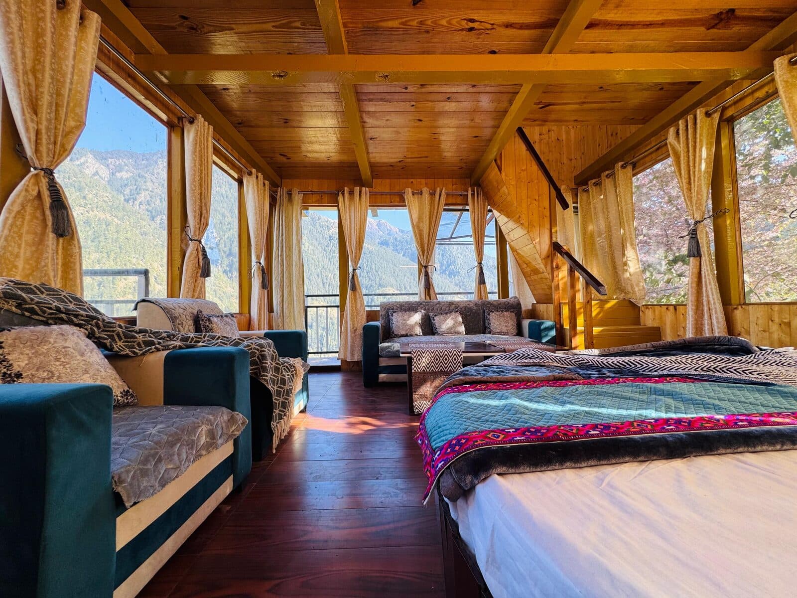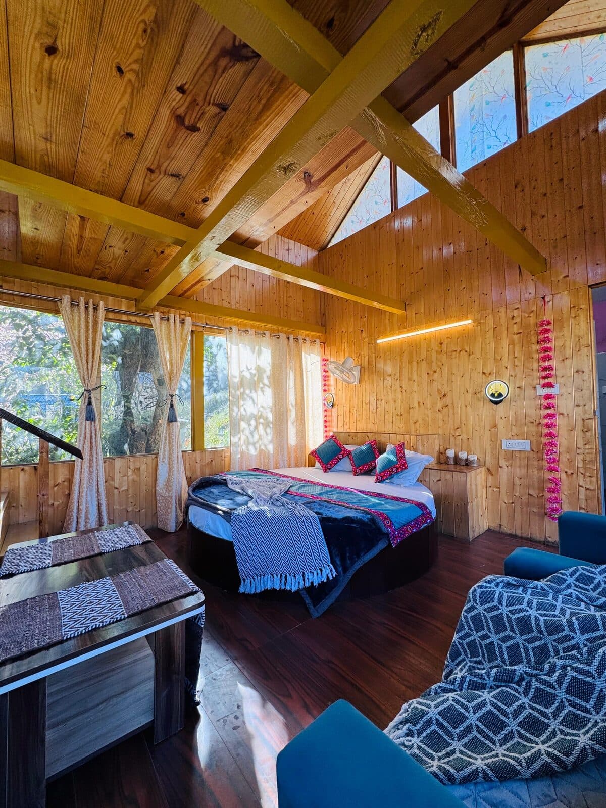 Built from the salvaged timber of old Himachali homes — a single-room log house with two king beds, a private glass bathtub on the balcony, and an apple tree growing right through the balcony.
